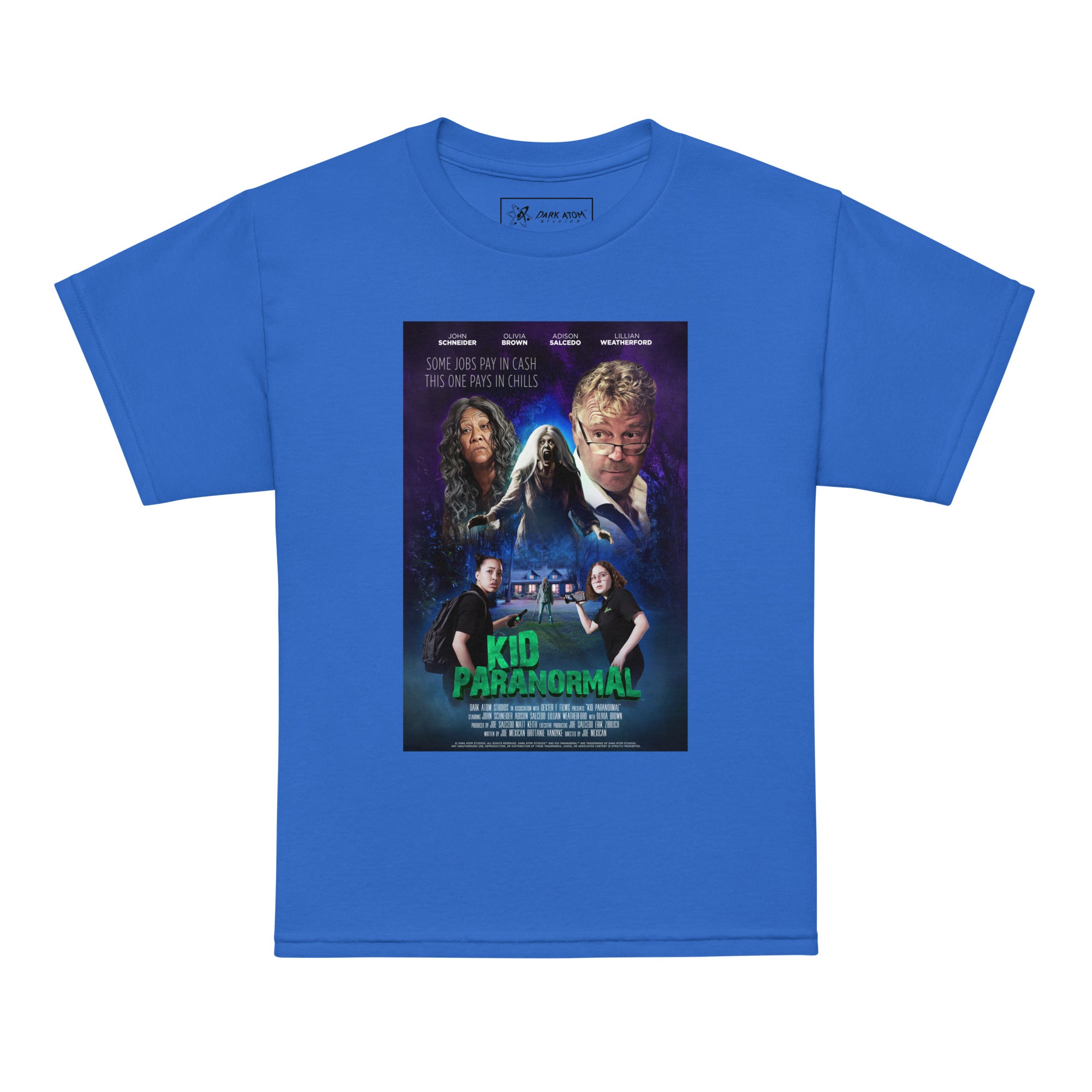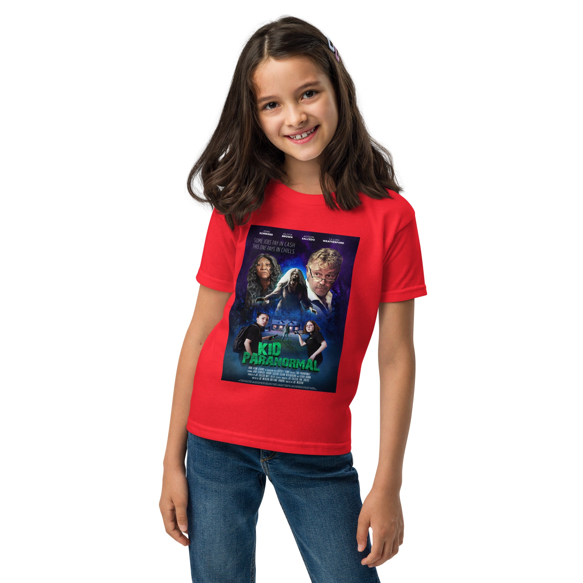 Get ready to show off your love for Kid Paranormal™ with the coolest t-shirt ever! Featuring fun, colorful artwork from the official movie poster, this shirt has all your favorite characters: Adie, Lilly, John Schneider, and Olivia Brown. The design brings the spooky world of Kid Paranormal™ to life with bright, exciting colors that are perfect for any young fan!
